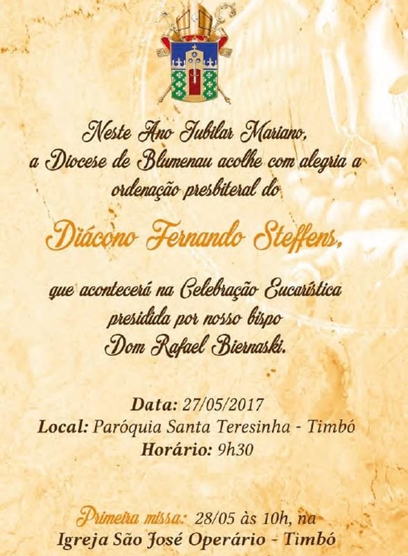 A ordenação acontece na Matriz da Paróquia de Timbó, no dia 27 de maio de 2017, às 9h30, e será presidida por nosso Bispo Dom Rafael Biernaski.