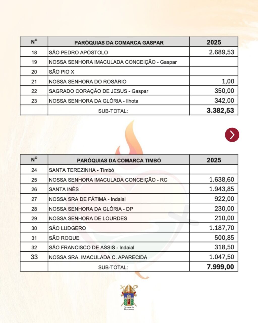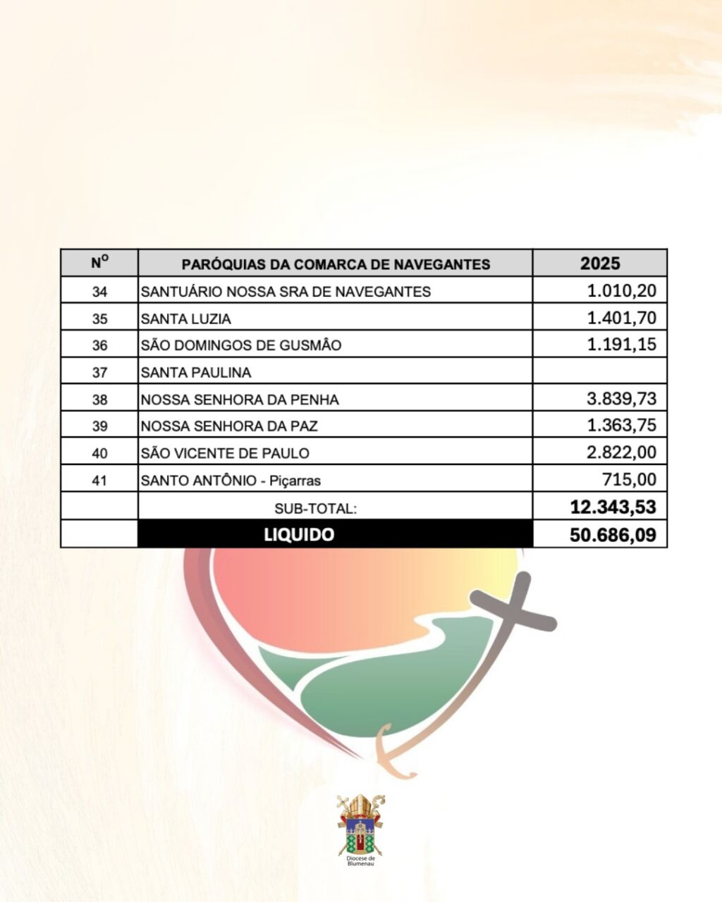 Com o tema “Peregrinos Porque Chamados”, a coleta deste ano alcançou o valor total de R$ 50.686,09, fruto da generosidade das paróquias das cinco comarcas que integram a Diocese: Blumenau/Sul, Blumenau/Norte, Gaspar, Timbó e Navegantes.
