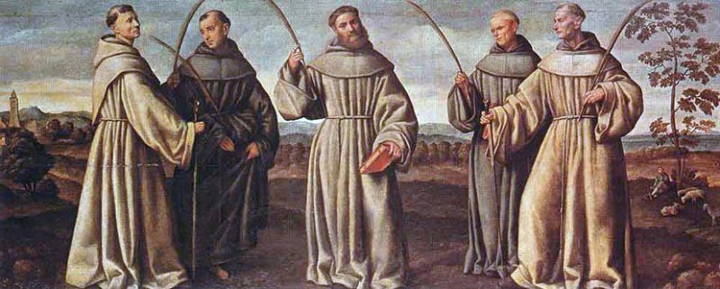 O irmão Elias de Cortona era o superior da Ordem, em 1227, quando os sete franciscanos viajaram da Itália para a Espanha, desejosos de transferirem-se para o Marrocos, na África, onde pretendiam converter os muçulmanos. Era um período de grande entusiasmo missionário nas jovens ordens franciscanas, fortalecidas pela memória de são Francisco, que morrera no ano anterior.