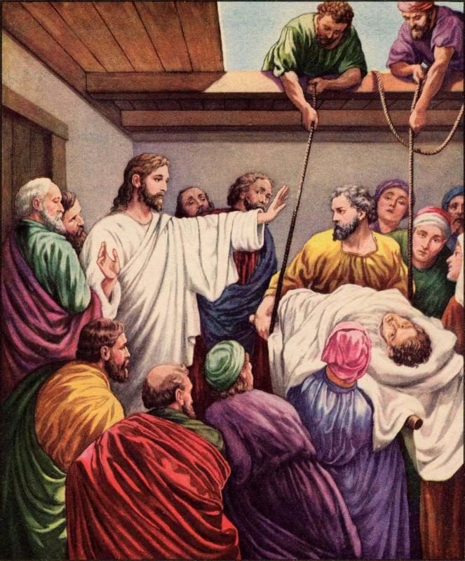 Ao ver a fé daquela gente, Jesus disse ao paralítico: «Filho, os teus pecados estão perdoados».
