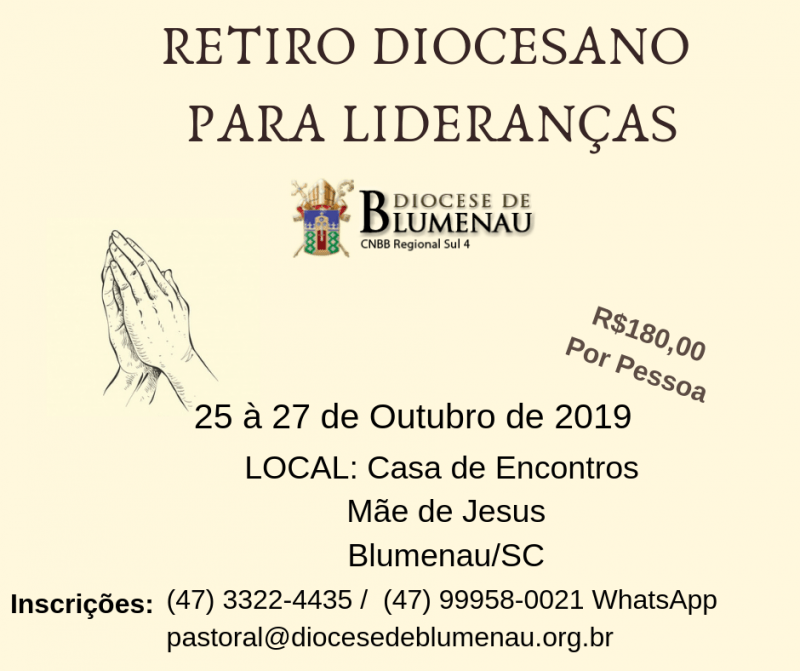 Inscrições serão aceitas via e-mail: [email protected] , whatsApp: (47) 99958-0021, ou entregue na recepção da Cúria Diocesana até dia 18/10/2019.